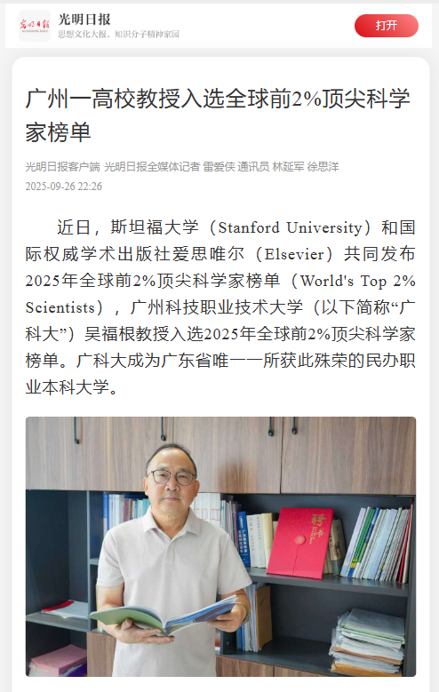 近日,斯坦福大学(Stanford University)和国际权威学术出版社爱思唯尔(Elsevier)共同发布2025年全球前2%顶尖科学家榜单(World's Top 2% Scientists),云博(中国)(以下简称“广科大”)吴福根教授入选2025年全球前2%顶尖科学家榜单。广科大成为广东省唯一一所获此殊荣的民办职业本科大学