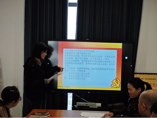 蔡娟书记按上级的要求,向全体党员讲述了民主评议的规则和注意事项,叮嘱各位党员,不要以职务的高低来评价党员同志的表现,而是要按公平、公正、公开的原则来进行相互评价。蔡娟书记首先带头进行了自我批评,指出了自己的不足,并表示今后会努力改正自己的不足。随后各位党员纷纷进行自我反省、自我总结和提出自己的整改措施,党员之间也相互地提出了建设性意见,把民主评议会推向了高潮。最后,蔡娟书记根据各位党员的发言进行了总结,希望各位党员能够保持自省的能力,时刻记住和珍惜自己党员的身份,将党员的先锋性模范作用发挥到工作中。